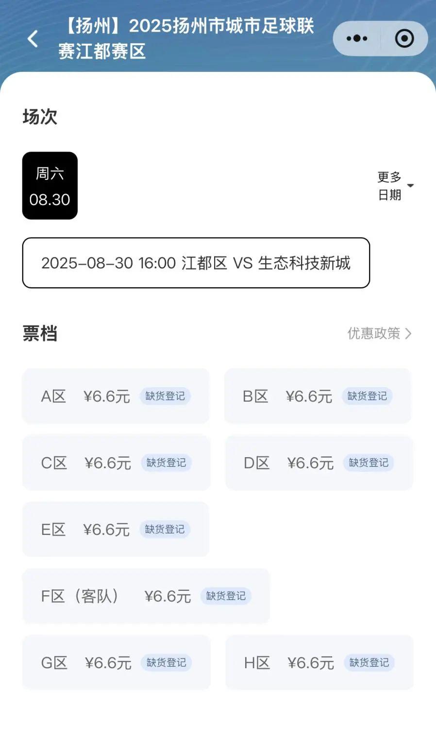 8月25日上午10点,“扬超”江都赛区首场比赛(江都VS生态科技新城)门票准时开售,短短半小时之内,数千张门票全部售罄。据了解,本次比赛票务资源已全部释放,不再安排第二轮售票,敬请谅解。